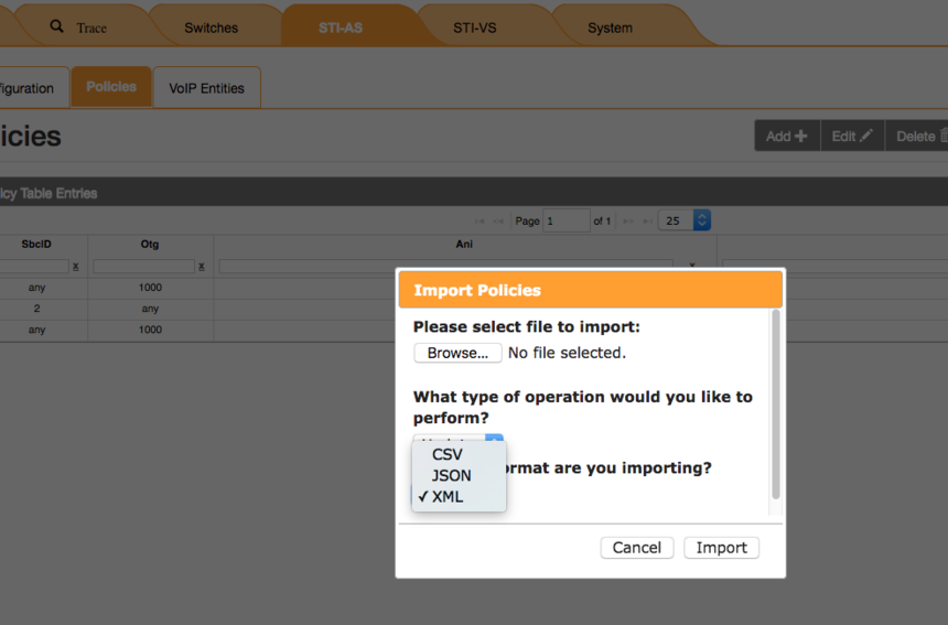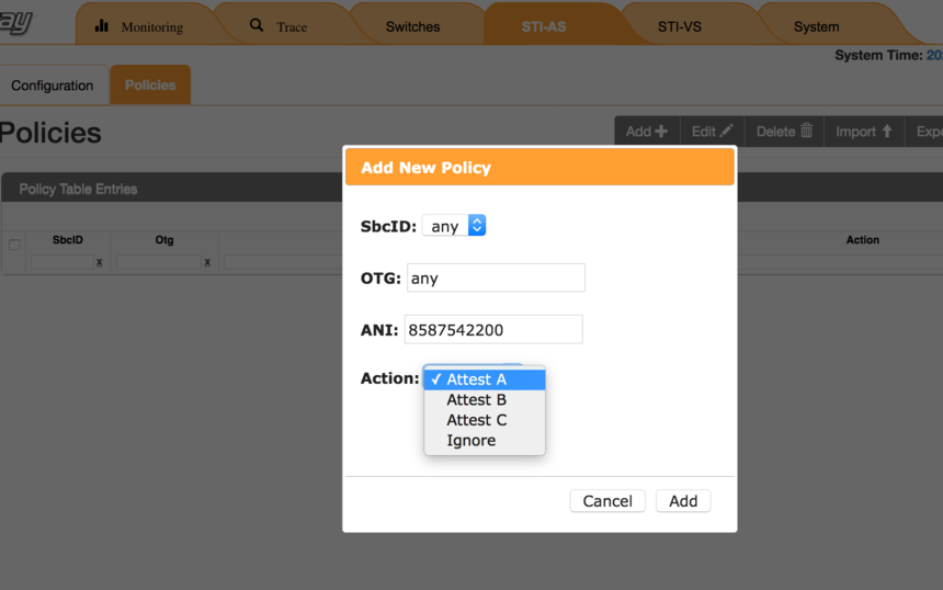 NSS uses SBC (originating switch/IP), OTG (originating trunk group), and ANI as the elements that determine the attestation level of a call. These rules are defined within the Policies tab under STI-AS > Policies (formerly Authorized ANI).