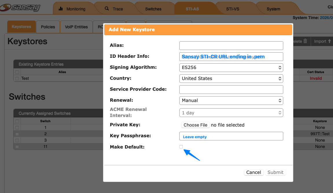 - When re-keying a Sansay NSS system, you will first need to import the new keystore and then update the keystore to all applicable switche/SBCs. Screenshots below. This is done under STI-AS > Configuration.